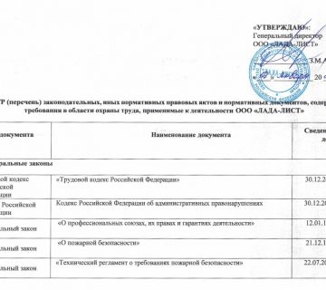 Реестр законодательных, иных нормативных правовых актов и нормативных документов, содержащий требования в области охраны труда, применимые к деятельности ООО “ЛАДА-ЛИСТ” Скачать ... Читать далее...