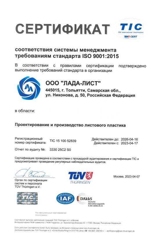 12.04-16.04.2023г на ООО «ЛАДА-ЛИСТ» успешно прошел повторный аудит для определения степени соответствия требованиям стандарта DIN EN 9001:2015 (ISO 9001:2015) и сертификационный аудит ГОСТ Р ИСО 9001:2015 (ГОСТ Р ИСО)